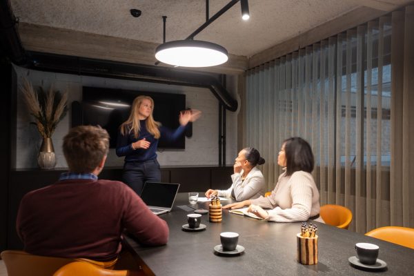 Ontdek onze splinternieuwe vergaderzaal! Deze stijlvolle ruimte biedt plaats aan maximaal 10 personen en is ideaal voor zowel formele vergaderingen als 1-op-1 gesprekken. Geniet van een rustige setting met moderne faciliteiten, waaronder een groot scherm, flipchart, high-end conference calling met camera, wifi, airco & verwarming, en gemakkelijke toegang tot sanitair.